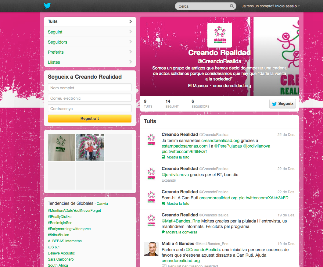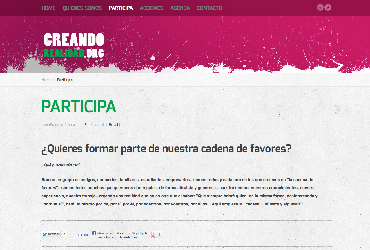 Creació de marca, web i perfils socials per el patrocini de una organització sense ànim de lucre que promou la creació de una cadena de favors entre les persones i les empreses. www.creandorealidad.org